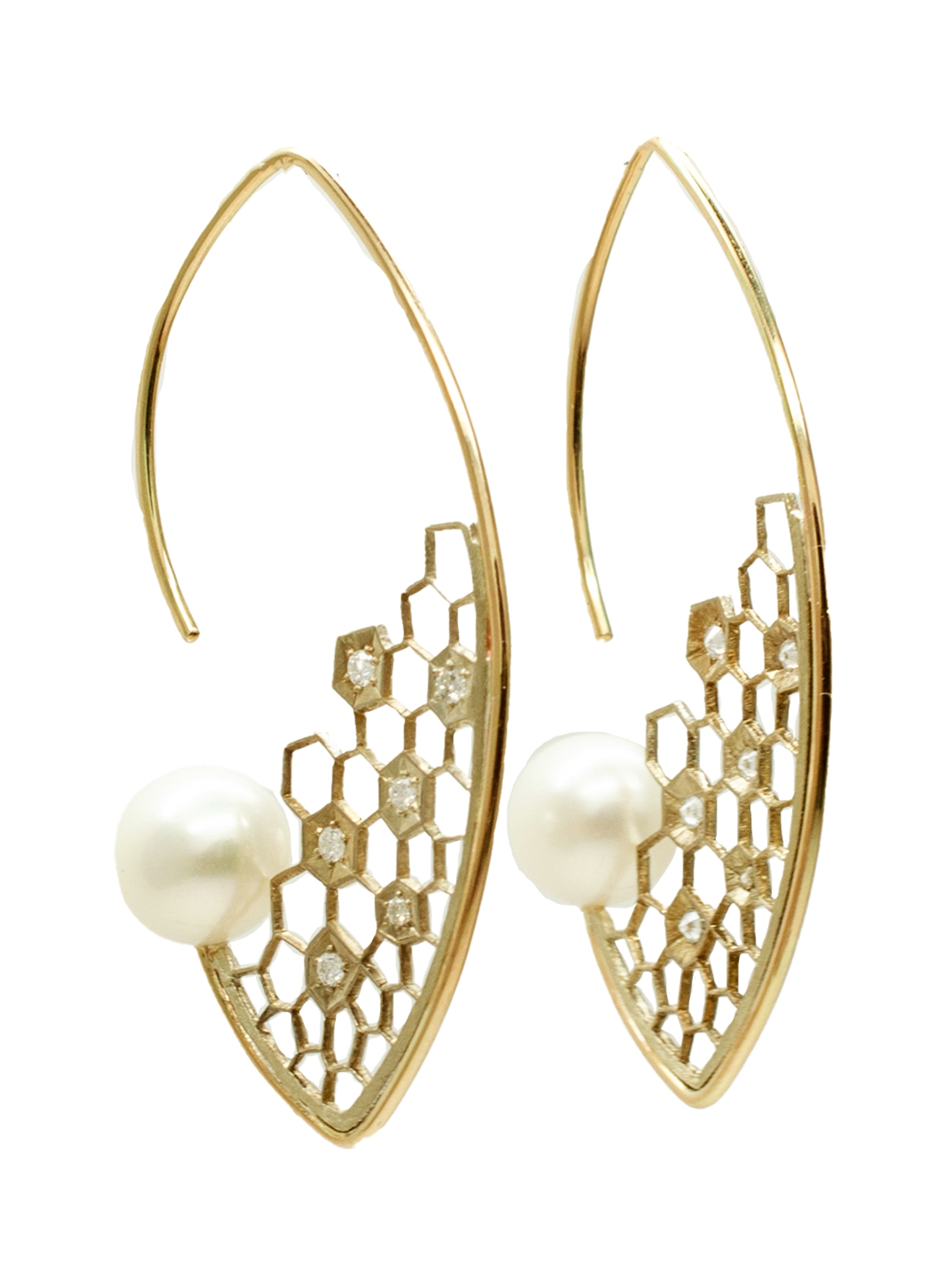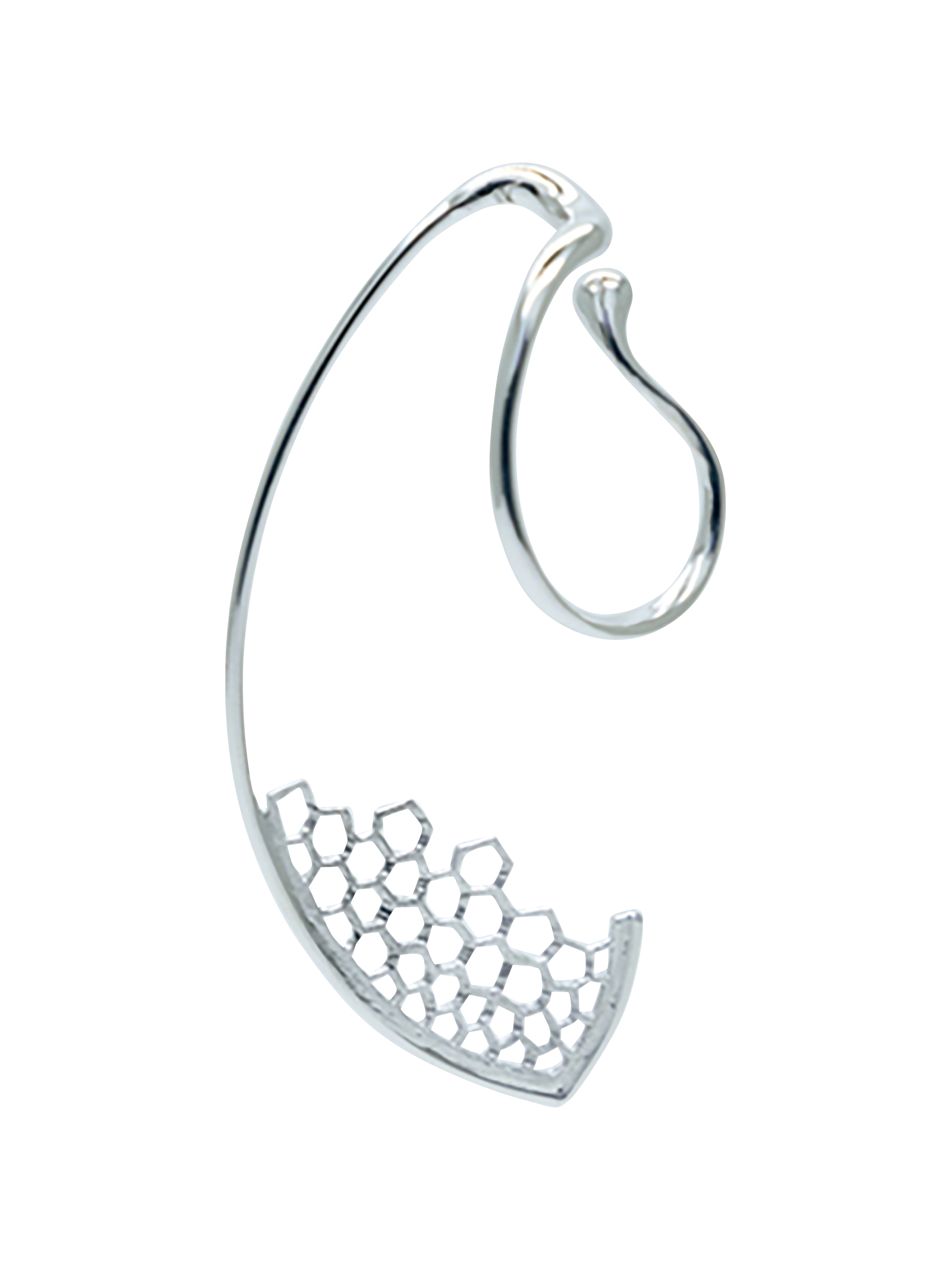 昨年発売し人気を博した同ブランドコレクション[蜂の巣]に新作イヤーカフが登場。ピアスホールがふさがってしまったお客様からの要望に応え[Vespa イヤーカフ]を開発いたしました。ピアスはK18素材にイタリアフィレンツェで洋彫りを学んだ職人が加工していますが、今回のイヤーカフはシルバー素材を採用しダイヤモンドポイントで凹凸をつける技法で製作。シリーズの要である軽やかな透かしを維持するために一つ一つ手作業で工芸品のように仕上げています。