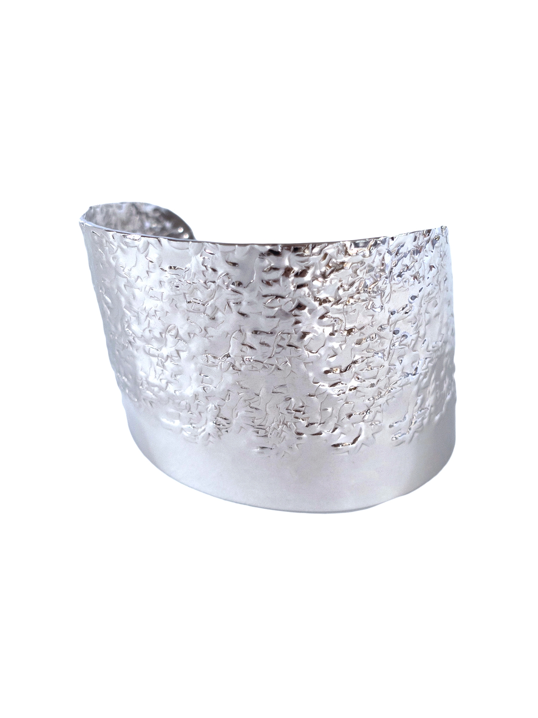 軽くてインパクトのあるバングルは、太陽の光をまばゆく照り返し輝く。カジュアルに使いやすいようできるだけ軽く、真鍮にて製作。およそ40グラムでゴルフボールと同じ重さ。鏡面仕上げとプレス加工の2つのテクスチャーがミックスされた手作りのバングルは板を糸鋸で切り抜くところからハンドクラフト。