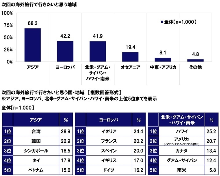 アジアでは1位「台湾」(28.9%)、2位「韓国」(22.9%)、3位「シンガポール」(18.5%)、ヨーロッパでは1位「イタリア」(24.4%)、2位「フランス」(20.2%)、3位「スペイン」(20.0%)、北米・グアム・サイパン・ハワイ・南米では1位「ハワイ」(25.2%)、2位「アメリカ(ハワイ・グアム・サイパン除く)」(20.7%)、3位「カナダ」(13.4%)だった。