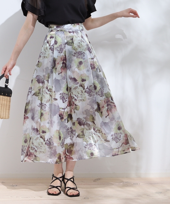 『オーガンフルールタックベルトスカート』は、キラキラの糸が織り込まれた光沢感の美しいオーガンジー生地に大胆なオリジナルの花柄デザインが目を引く “主役級”スカートです。