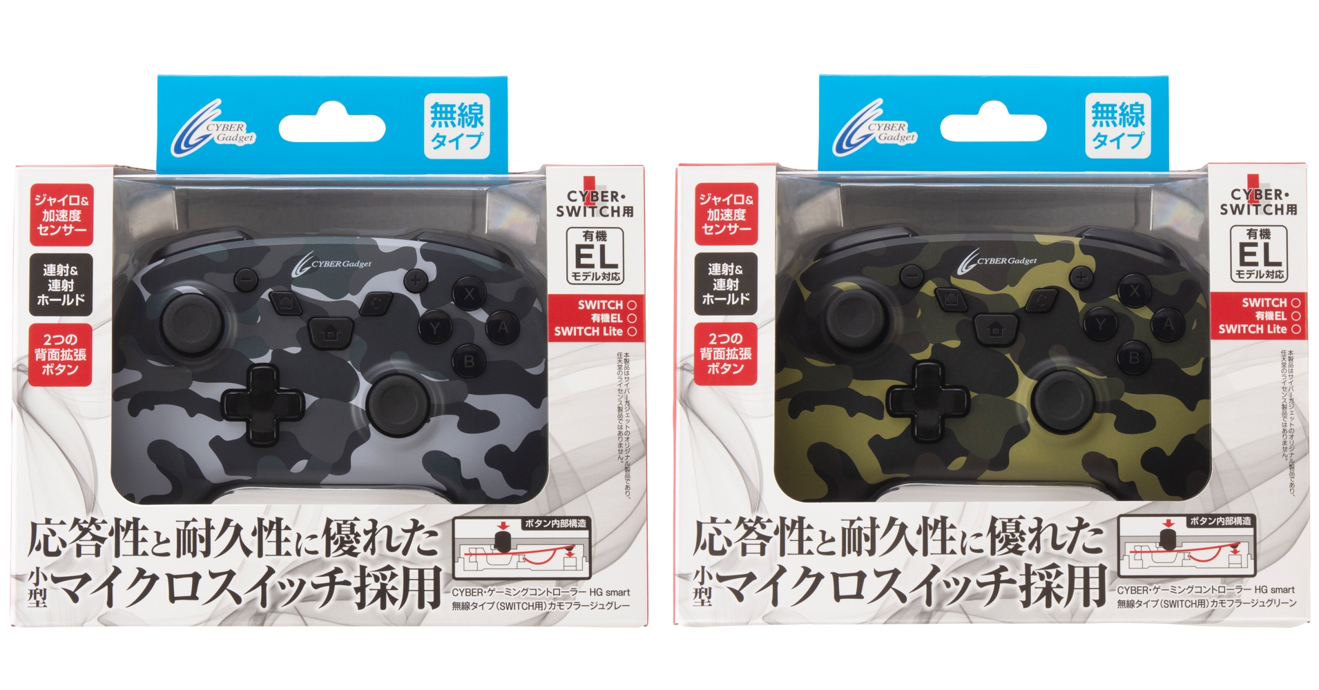 本製品は、ジャイロ&加速度センサーを搭載したSwitch用コントローラーです。十字、ABXY、L/R、ZL/ZRボタンには、軽い力で反応し、応答性と耐久性に優れた小型マイクロスイッチを採用。カチカチとした打感で快適に操作できます。また、背面には2個の拡張ボタンを搭載しており、前面ボタンの機能を割り当てて使用できます。さらに、便利な連射&連射ホールド機能も搭載。Nintendo Switchシリーズのほか、パソコンなどにも対応しています。今回、ご好評いただいている「ブラック」「ブルー」などの既存カラーに加え、新たに「カモフラージュグレー」「カモフラージュグリーン」の2色が発売となります。