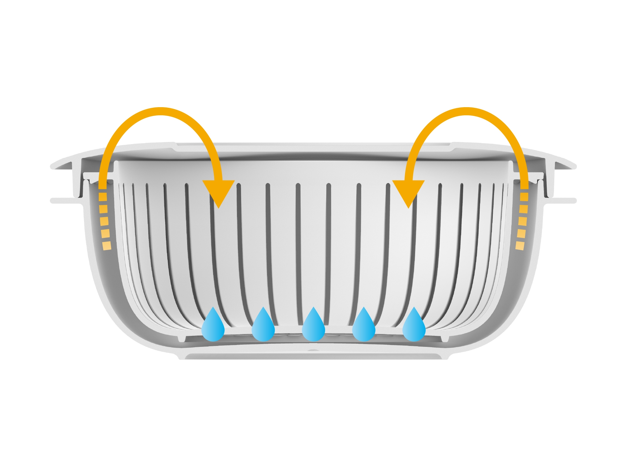細長い縦スリットは水切れがよく、料理の下準備や様々な食材の保存にも重宝します。トマトやキャベツ、豆腐の水切りなどにも使え、料理の効率化を図れます。