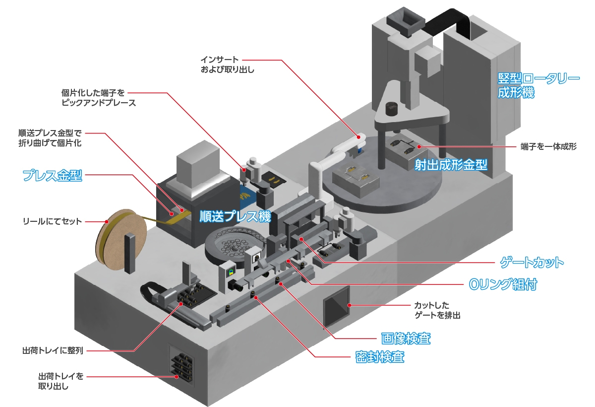 自動機のご提案のみならず、生産プロセス全体の見直しからお手伝いいたします。成形技術をはじめ、I-PEXが培ったものづくりのコア技術と、製造プロセスで必要となる「接着」「接合」「溶着」「電気検査」などを組み合わせることで、ものづくりのスタートから完成まで、プロセス全体をご提案いたします。