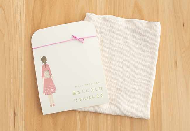 当社の『プラスニド 四季のはらまき』シリーズは、農薬や化学肥料に頼ることなく自然の循環過程で栽培された綿花から化学薬剤を使わず製糸したGOTS(オーガニックテキスタイル世界基準)認証のオーガニックコットン糸を、日本に数台しかない昔ながらの編み機で日本の職人が1枚ずつ丁寧に仕上げています。季節に関係なく冷えに悩む女性の「体感温度を2℃上げる」ことをコンセプトに、春夏秋冬それぞれの気温に合わせて厚み・長さ・編み方を変えていることが特長です。