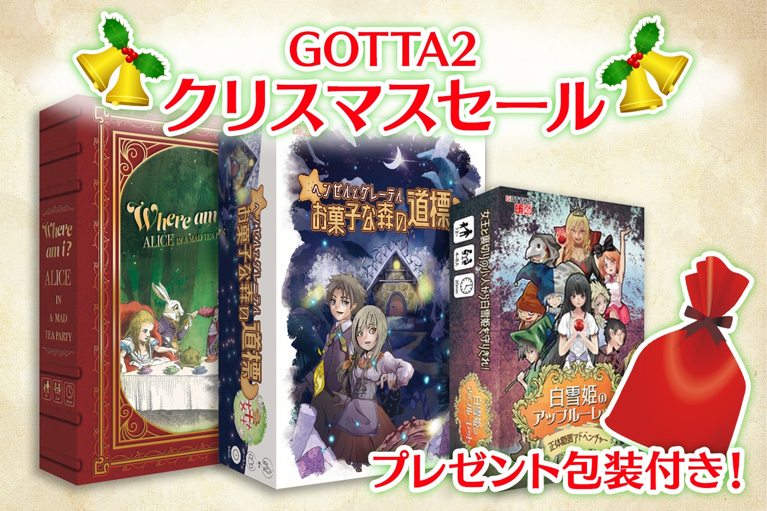 GOTTA2の通販サイトにて「シティコネクト」「かぐや姫はカンヨークを覚えたい」「寿しロワイヤル」が購入が可能になります。これを記念して、単品での購入に加えて、よりお得にGOTTA2のゲームが購入できるクリスマスセールキャンペーンを開催致します。セット商品はプレゼント包装をして送付致します。販売価格はすべて送料込み!是非ご利用ください。