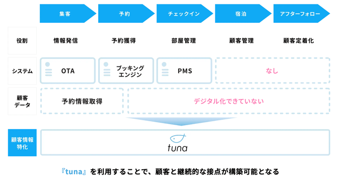 今回リリースの『tuna』は、ゲスト一人ひとりに合わせた宿泊体験作りを創出できる、宿泊施設向けクラウドシステムです。従来の宿泊運営プロセスでは、システムが散在しているためゲストデータがシステム毎にバラバラに管理され、ゲスト一人ひとりに向き合うことが困難でした。