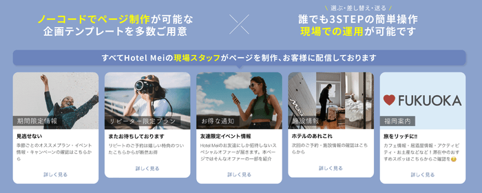 旅前ではデザインテンプレートが多数用意された宿泊特化のブッキングエンジン機能、旅中では施設・サー ビス情報や周辺情報の配信機能、旅後ではお礼メッセージやリピーター特典、ゲスト属性に応じた特別オファー等の配信機能など、『tuna』を活用することにより、旅行のあらゆるステージでゲスト一人ひとりに合わせたアプローチが可能です。
