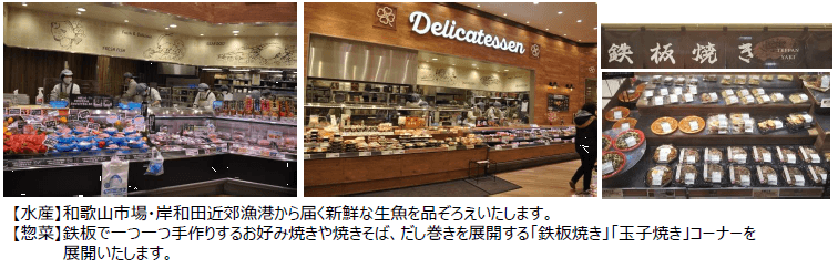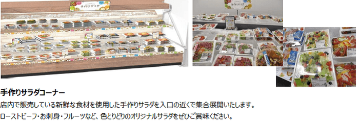 モール型店舗ならではのごちそうメニューや、味も見た目のおいしさもお楽しみいただける新商品を品ぞろえし、当店だけの「限定商品」も登場いたします。また、商品を選びやすくお買い物しやすい売り場を実現するため、サラダと魚惣菜をそれぞれ集合展開するほか、メイン入口に惣菜・手作りパン売り場を配置し、時短ニーズに対応いたします。