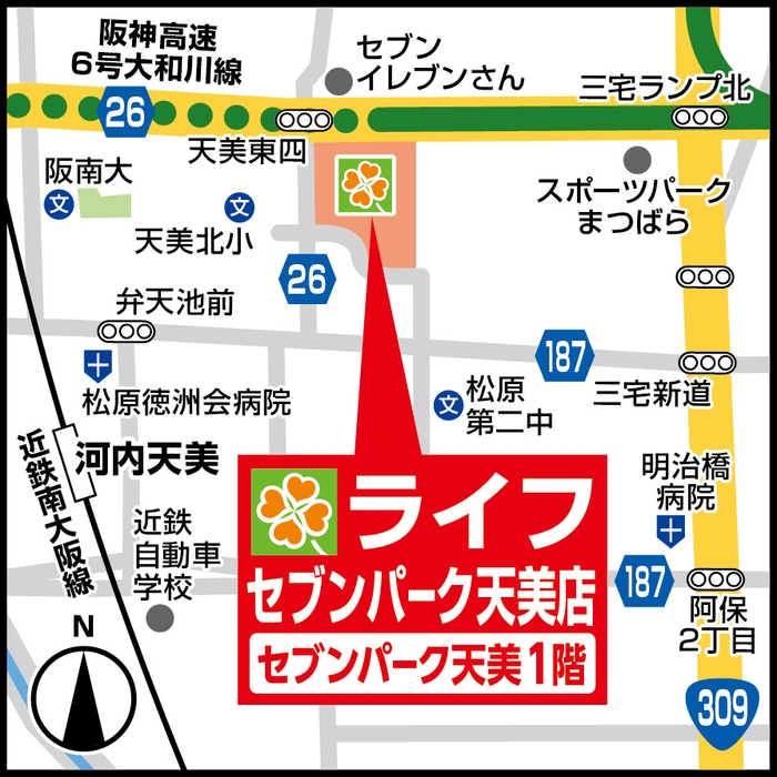 ・当店は、国道309号線・県道12号線・阪神高速「三宅IC」が交わるポイントに位置するショッピングモール「セブンパーク天美」の1階に入店しています。セブン&アイ・クリエイトリンクの手がける大型商業施設に、ライフが初出店いたします。