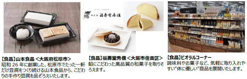 「地産地消」を推進する地元松原市や近隣地域でつくられた商品、環境・健康に配慮したサスティナブル・ヘルシーな商品を取り扱います。また、「ビオラルコーナー」では、「オーガニック」・「ローカル」・「ヘルシー」・「サステナビリティー」をコンセプトに、体に優しい商品を取りそろえます。