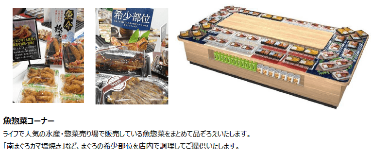 <ライフオリジナルサラダと魚惣菜を選びやすく集合展開>