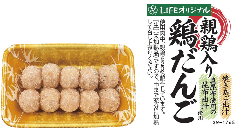 親鶏のもも肉・むね肉を配合しており、食感と旨味を楽しむことができ、焼あご出汁の味わい豊かな風味を感じることのできるライフオリジナルの鶏だんご。餃子のタネなど、アレンジしてお召し上がりいただくこともおすすめです。