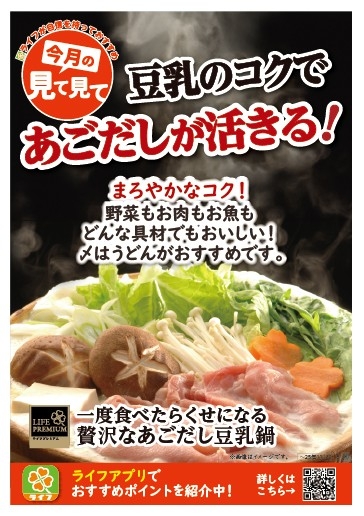 今年も長い夏が終わり、鍋が恋しい肌寒い季節がやってきました。「あごだし豆乳鍋」は、素材・製法にこだわり、おいしさを追求したプライベートブランド「ライフプレミアム」の「そのまま飲んで美味しい 贅沢なあご入りおだし」・「徳島県産阿波尾鶏エキス」・「利尻昆布だしエキス」を使用することで"だし感"の感じられる豆乳スープに仕上がっており、お野菜・お肉・お魚、どの食材とも相性抜群で、その名のとおり"一度食べたらくせになる"豆乳鍋です。