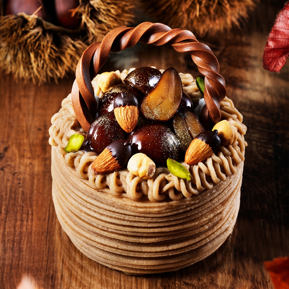 どんぐりに見立てたアーモンドをポイントに、ヘーゼルナッツとピスタチオ、大きな栗をごろごろとバスケットに詰め込んだような可愛らしいモンブランのデコレーションケーキ。