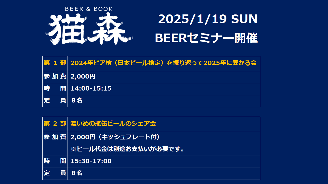 2024年11月宝塚市に新規オープンしたBEER&BOOK猫森にて、日本ビール検定1級を8回連続合格・一流国際ビール審査会審査員を務める長谷川 小二郎氏を講師に招き、第一部「2024年ビア検(日本ビール検定)を振り返って2025年に受かる会」第二部「濃いめビールシェア会」を開催します。