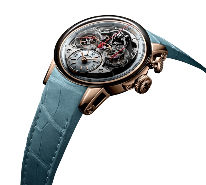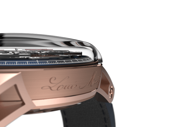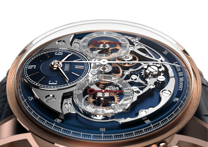 クロノグラフを世界で初めて製作した伝説の時計師の名を冠するルイ・モネ。ブランドの象徴ともいえるクロノグラフが最も美しく見えるように、表側(文字盤側)にコラムホイールを始めとするクロノグラフ機構を配置する、ユニークな自社製キャリバーを搭載しています。ドーム状のサファイアクリスタルガラス風防により、あらゆる方向から時計の内部を鑑賞することができます。