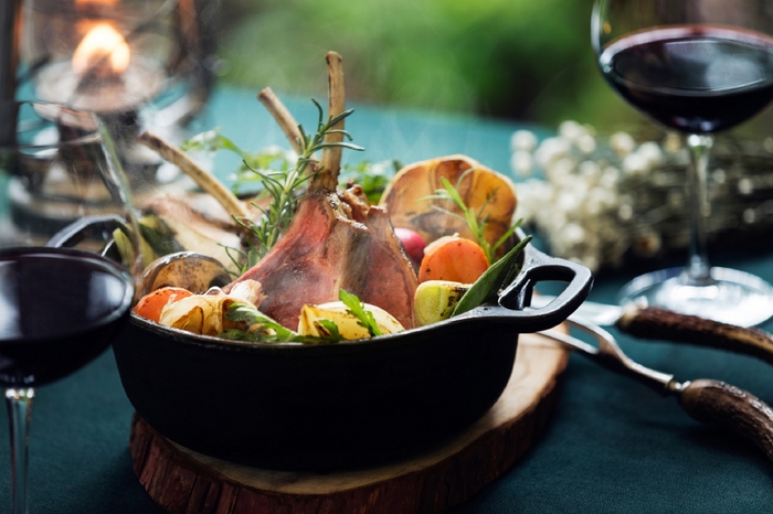 森の中にあるアウトドアダイニングで用意する体験型のディナーです。グランピングマスターのサポートの下、アウトドア器具で料理を仕上げ、旬の野菜と共に狩猟肉を楽しめます。季節の変化によって味わいが異なる「鹿肉」や「猪肉」などの狩猟肉の魅力を、おひとりさま用のボリュームで提供します。