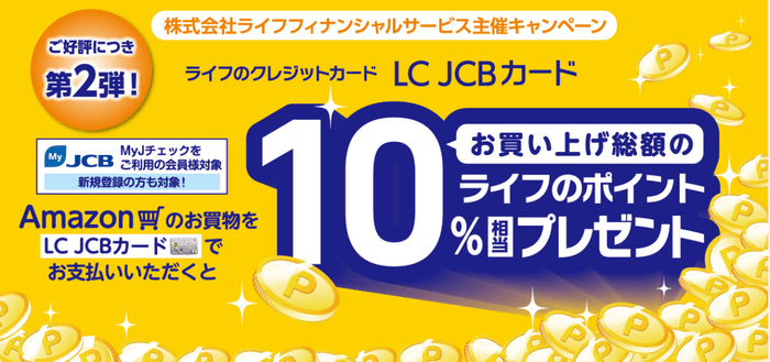 ライフのクレジットカード「LC JCBカード」を運営する株式会社ライフフィナンシャルサービスは、2020年12月16日(水)から2021年1月31日(日)まで、Amazonのお買い物でライフのクレジットカード「LC JCBカード」をご利用いただくと、「MyJチェック」にご登録されている会員様を対象に、お買い上げ総額の10%相当のライフのポイントを進呈するキャンペーンを実施しておりましたが、ご好評につき2月1日(月)から3月15日(月)まで、第2弾を実施いたします。