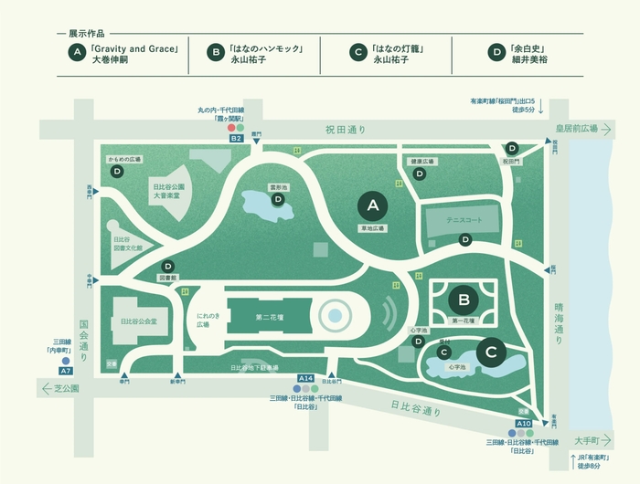 本イベントは、キュレーターを山峰潤也氏が務め、「公園という都市の隙間の中で変化していく日の光を感じながら、自然への想像力を駆り立てること」をコンセプトに大巻伸嗣氏、永山祐子氏、細井美裕氏ら3名のアーティストによるアート体験を提供します。日中は永山祐子氏の「はなのハンモック」を中心としたプレイグラウンド、夜は光を放つ大巻伸嗣氏の「Gravity and Grace」、細井美裕氏がサウンドスケープの視点から日比谷公園の音を収集し再構築した「余白史」など、一日を通して公園での新たなアート体験をお楽しみください。