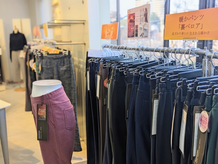 ミセス向けのデザインから、より幅広い層に着用して頂けるノンエイジなデザインにリニューアルした、定番素材の『TR両面起毛ドビーパンツ』など、様々な商品をお客様よりご好評いただきました。
