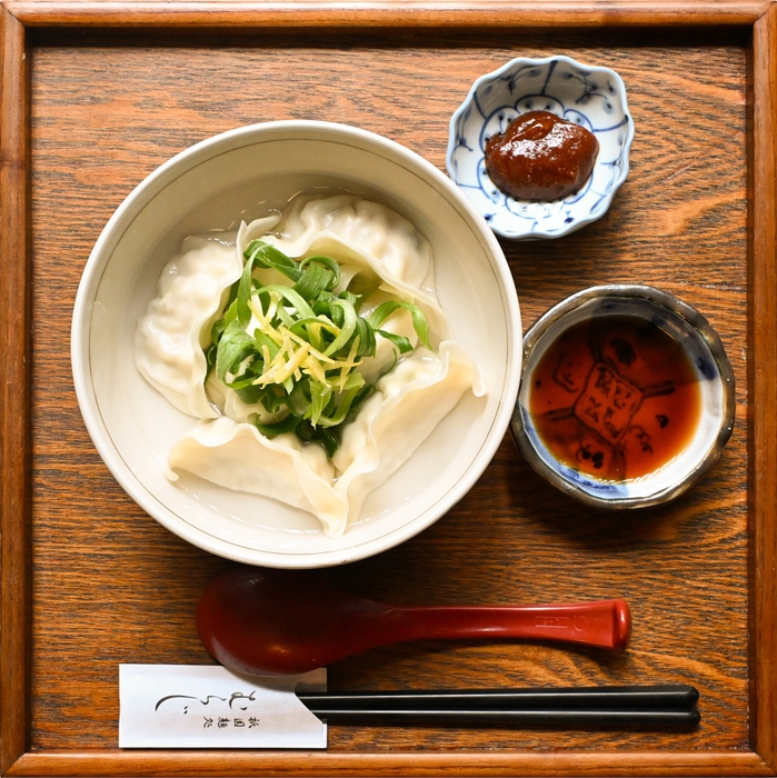 京都の⽼舗の澤井醤油と千⿃酢を使った『酢醤油』で、さっぱりと。また、濃厚な旨味と⾟味の『味噌⾖板醤』で濃厚な旨味を楽しむことも。スープの中に餃⼦を⼊れて『鶏⽩湯⽔餃⼦』としてもお楽しみいただける遊び心のある餃子です。