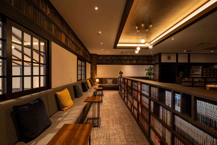 約3,000冊の漫画が並んだ本棚と適度な明るさの照明配置で癒しの空間を演出