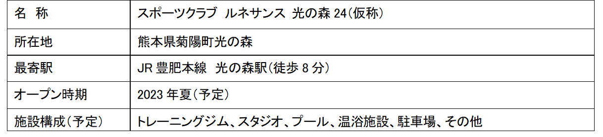 株式会社ルネサンス(本社:東京都墨田区、代表取締役社長執行役員:岡本利治、以下「当社」)は、2023年夏に「スポーツクラブ ルネサンス 光の森24(仮称)」を、熊本県菊陽町に出店いたしますのでお知らせいたします。
