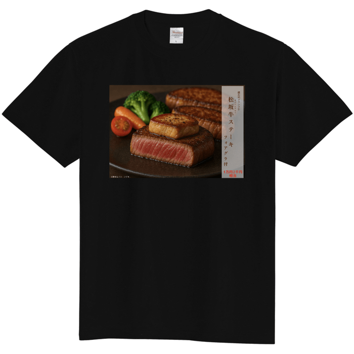 過去に大当たり賞品となった高級食材の写真を大胆にTシャツにプリント。インパクト抜群でユニークなデザインは全5種類。(例:松坂牛ステーキフォアグラ付、フカヒレ姿煮等)