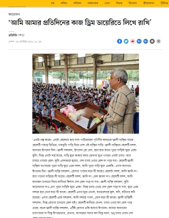 彼は夢達人ライヴの中で「人生は諦めないことが大切」であるということを何度も生徒に伝えました。夢を叶えるためには「本を読み、教養を深めていくことが重要である」と最後に締めくくり、生徒たちは読書を習慣化する大切さを深く学びました。夢達人ライブ終了後、ア二スルさんが学校見学をされた際に、夢教育にとても関心を持たれたようで、次の日のオンラインニュースにNDMSCの夢教育を取り上げて頂きました。NDMSCはバングラデシュでとても良い評判になっており、採用試験には7名の採用枠に約1200人の先生たちが応募をしてきます。これからもバングラデシュの教育モデル校になるために、バングラデシュでも一番生徒の夢を叶える学校を目指していきます。