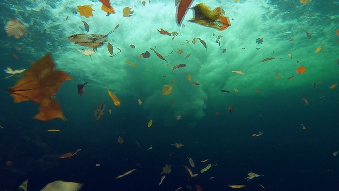 透明度の高い水の中を潜ってみると、川の底には落ち葉が降り積もっていました。