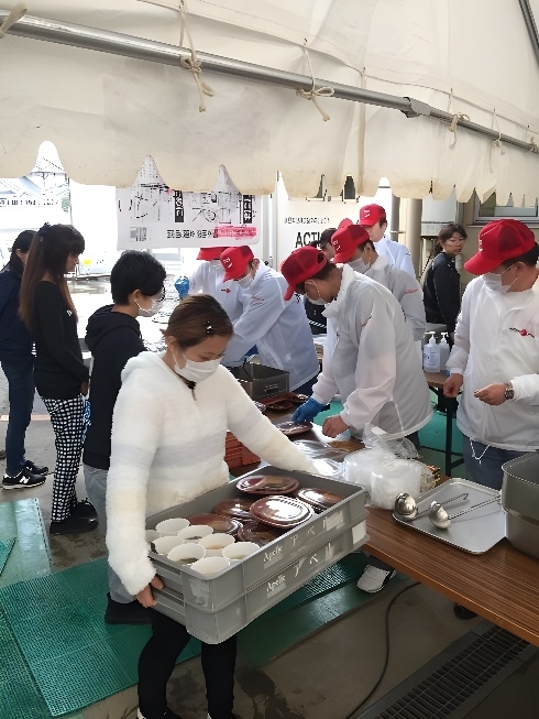 震災派生直後より被災地にて炊き出しを実施。石川県七尾市の小学校・コミュニティセンター等3カ所で1日計300 食(朝・夜)、および中能登町にて1日計200食(昼)の食事提供を実施しました。また、食材・水・資材不足に対応するため、グループ会社と連携し、完全調理品等の食材、水、野菜ジュース、消耗品を現地へ送り届けました。