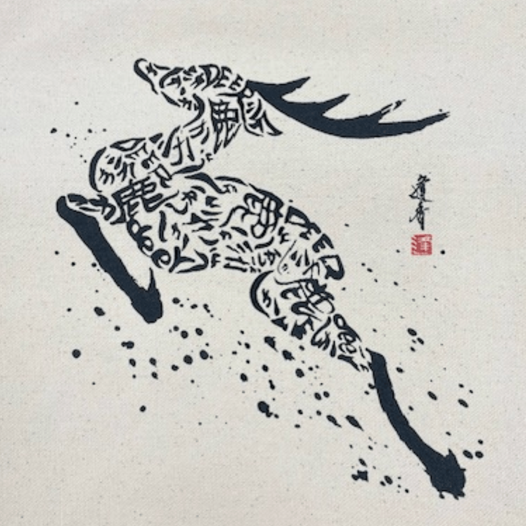 墨の濃淡で描かれた鹿の姿に、ひらがなの「しか」、漢字の「鹿」、英語の「DEER」など、さまざまな文字が散りばめられ、“妖怪書家”として活躍する逢香さんならではの、遊び心あふれるデザインが光ります。
