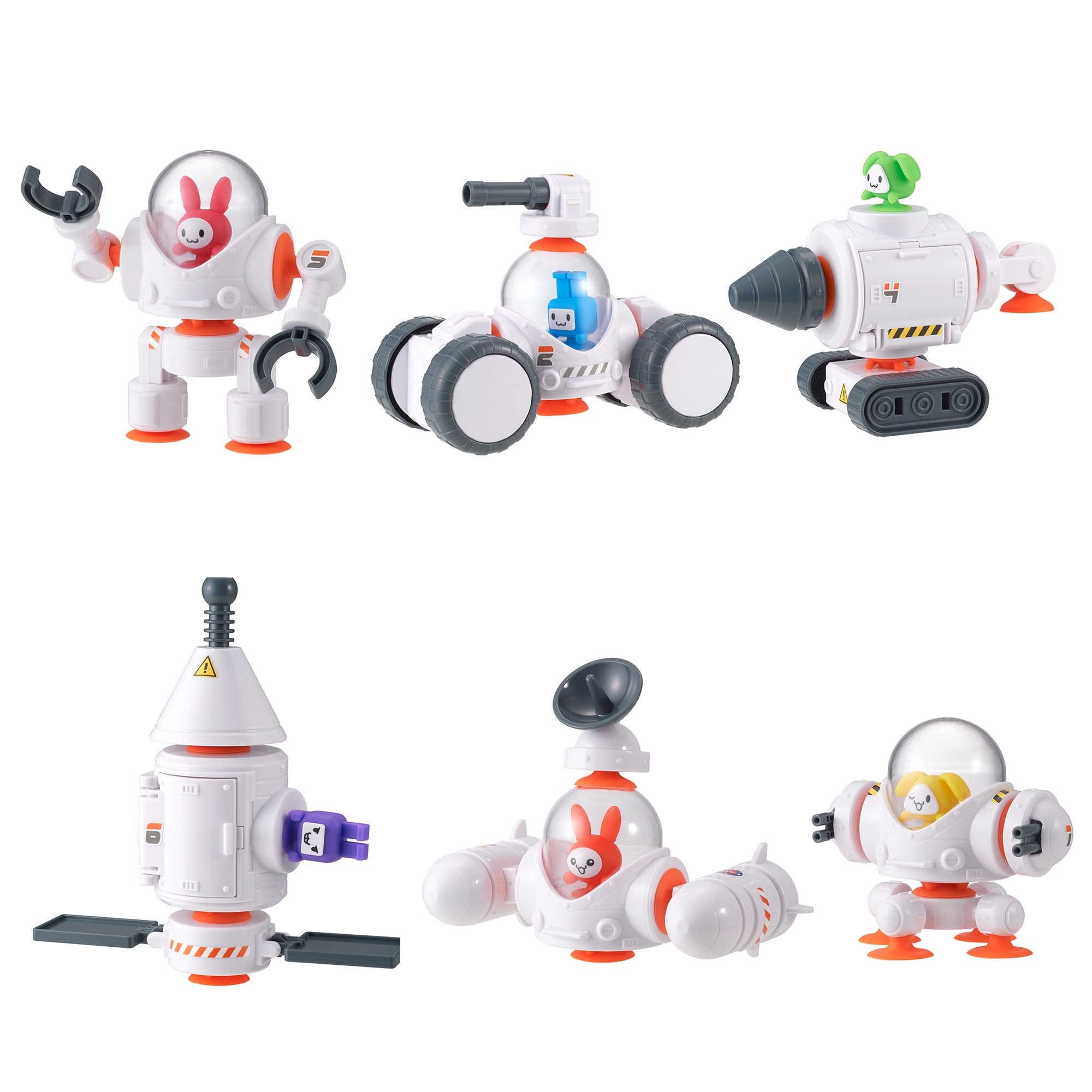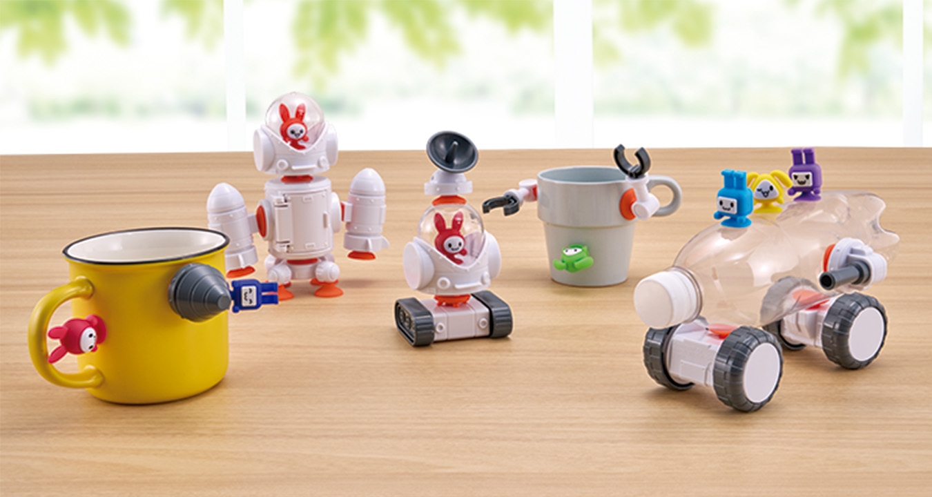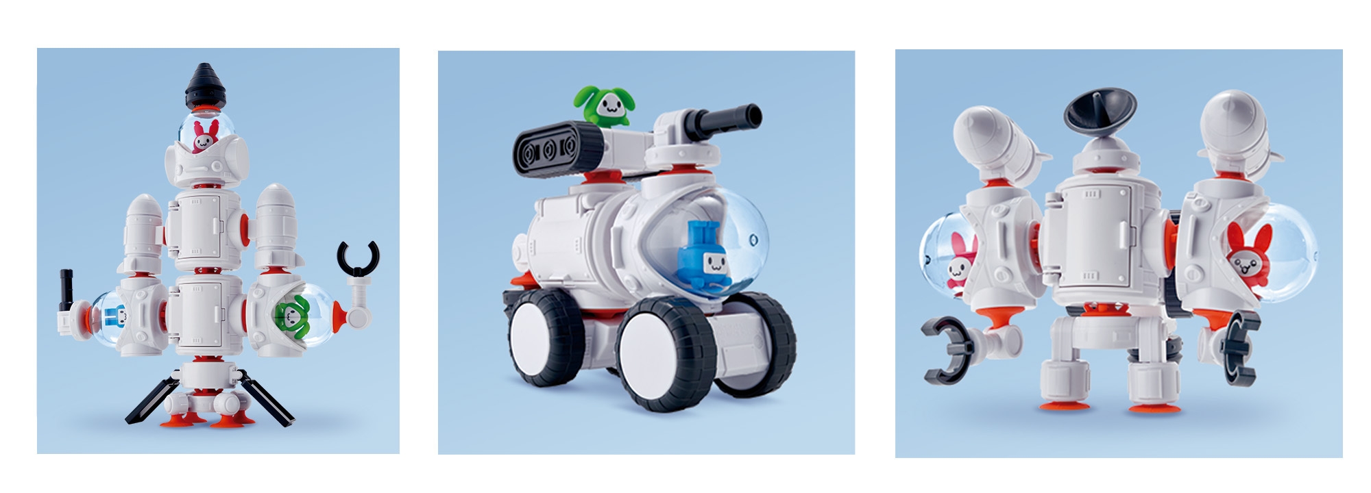 『QBINE(キューバイン)』は、吸盤でくっつく“ウサギによく似たキャラクター”「ウサキュー」を、吸盤ジョイントで合体させて作るメカ「キューバイン」に乗せたり、直接くっつけたりして遊ぶことができる玩具です。さらに吸盤がくっつく素材・アイテム(例:ペットボトル、マグカップなど)と組み合わせることで、オリジナルの合体遊びも楽しめます。