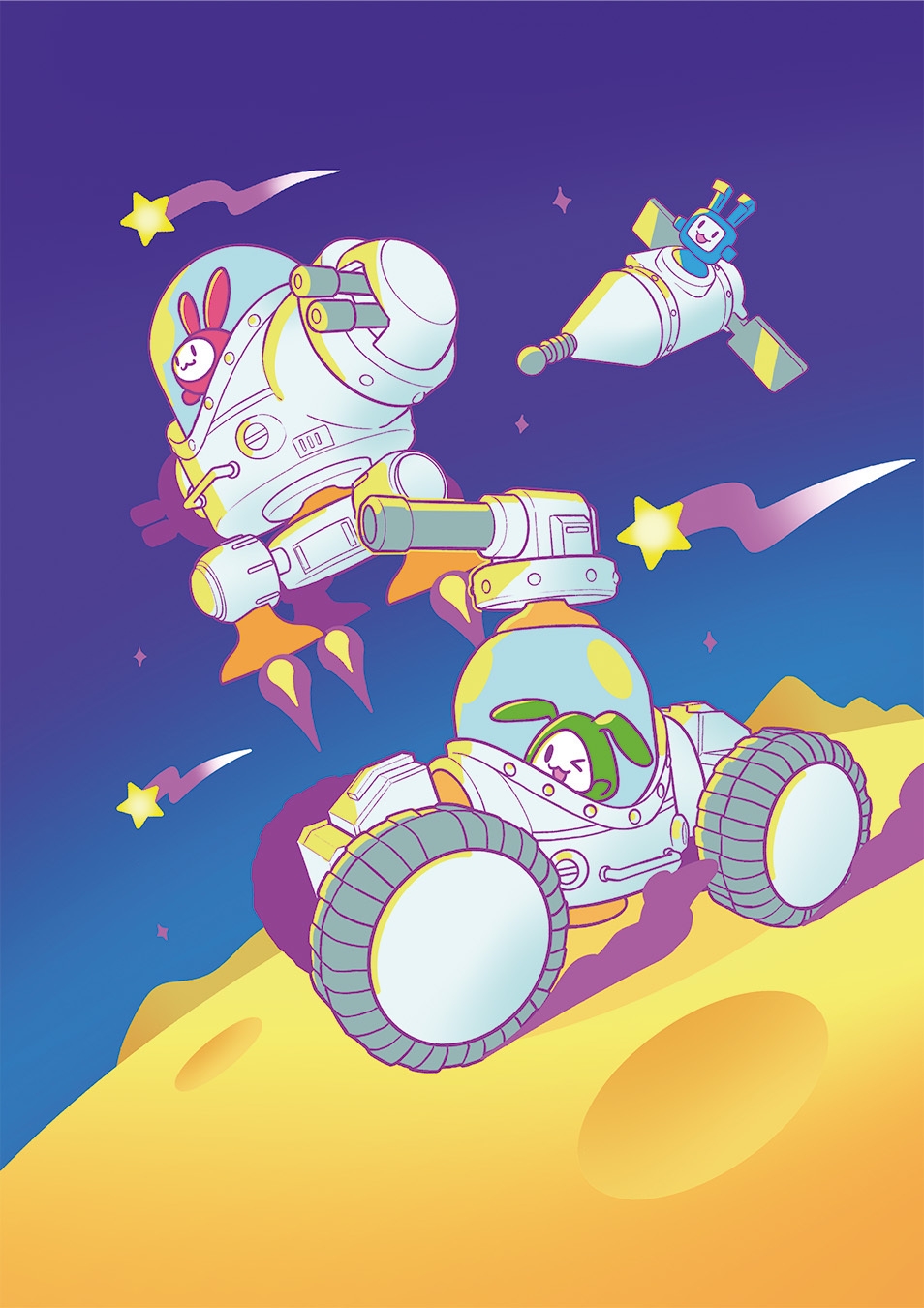 吸盤ジョイントを備えたメカ「キューバイン」で地球のあらゆるものをメカに変えながら、ちょっぴりおっちょこちょいな「ウサキュー」達の大冒険が始まります!