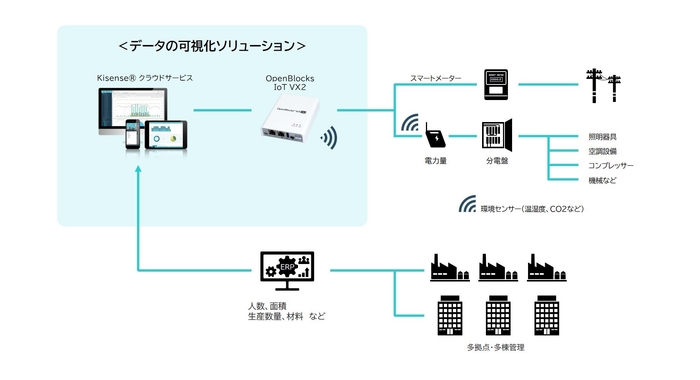 *1: Kisense(R)のクラウドサービスと、OpenBlocks IoTとを連携し、スマートメーターから電力使用量データの取得やセンサーデバイスを活用することで、設備機器やエリア間の消費電力を管理・分析することが可能です。また、温度・湿度・CO2濃度などの環境センサーと連携し、取得したデータをもとに、環境分析や設備機器の制御が可能となっています。さらに、太陽光発電装置や蓄電池、EVチャージャーを総合的に管理することで、施設全体の最適運用を実現します。
