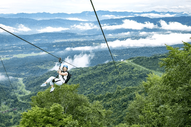 ロッテアライリゾートのジップツアーは標高950mのスタート地点から一気に全長1,501mを下り降ります。その高低差はなんと240m!最高時速は80kmを超え、妙高の空を駆け抜ける体験が味わえます。