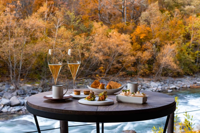 夕食は、夕日に煌めく渓流を望むテラスで、旬の食材を使った料理や銘醸ワインが味わえるフレンチレストラン「Sonore(ソノール)」の季節限定メニューを提供します。渓流沿いのテラスで瀬音を聞きながら食前酒とアミューズを味わう「渓流アペリティフ」では、愛犬の食事も用意しています。テラスで乾杯した後は、奥入瀬渓流の自然をイメージしたメインダイニングに移動します。専用のケージが用意された個室で料理を提供するため、他のお客様の目が気にならず、愛犬が寛いでいる横で、安心して食事を楽しめます。また、フランス・ブルゴーニュ地方の銘醸ワインを中心に、約150種類、2000本のワインを用意しており、それぞれの料理に合わせたペアリングも提案しているため、ワインと料理のマリアージュを楽しめるのも魅力のひとつです。