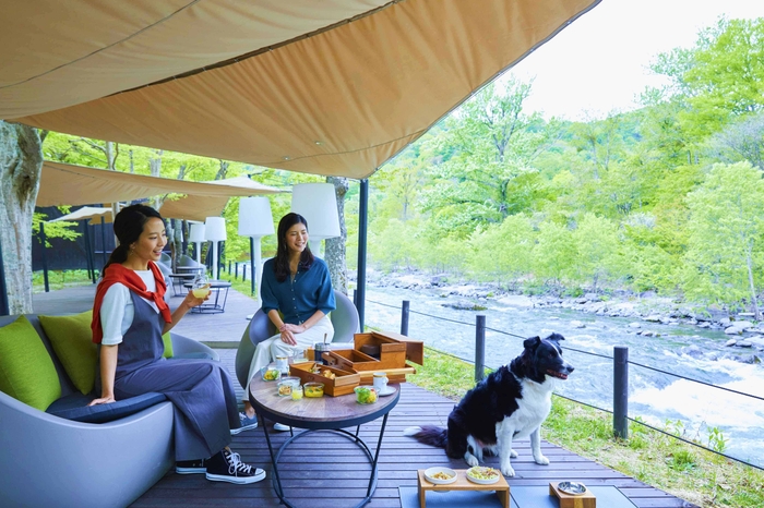 特徴3 早朝の澄んだ空気の中、愛犬と共に楽しめる「渓流テラス」での朝食