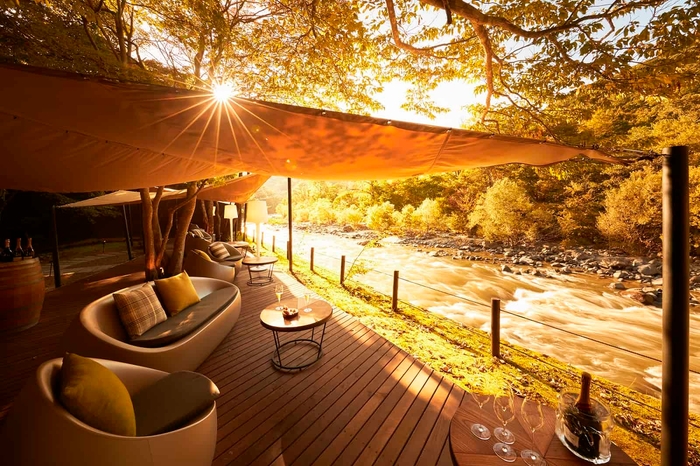 特徴2 愛犬と一緒に夕日に煌めく渓流を眺めながらの夕食