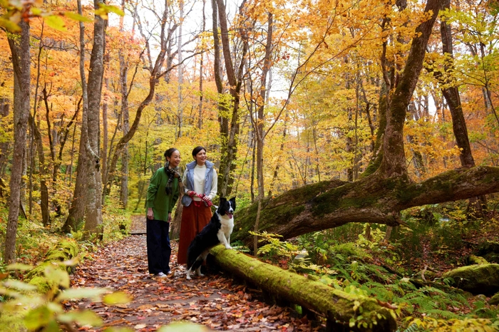 奥入瀬渓流は、季節ごとに見られる景色や色が全く異なることも魅力のひとつです。春は芽吹きや新緑、夏は涼しげな森や迫力ある滝、秋は100種類以上の樹木が作り上げる黄葉した森や、至る所からポコポコと顔を出すキノコ、冬は氷瀑(ひょうばく)や白銀の世界など、多様な世界が広がります。そんな世界を愛犬と一緒に満喫できるのがこのツアーです。奥入瀬渓流を熟知したネイチャーガイドが、天候や森の状態、お客様の体調などに合わせて、愛犬と一緒に楽しめる、その日1番のおすすめスポットへ案内します。