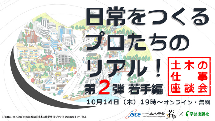 公益社団法人土木学会若手パワーアップ小委員会では、学芸出版社と協働で、 土木業界の「リアル」を伝える多業種トークイベント、「日常をつくるプロたちのリアル 第2弾 若手編~土木の仕事 座談会」を2021年10月14日(木)19時よりオンラインで開催します。