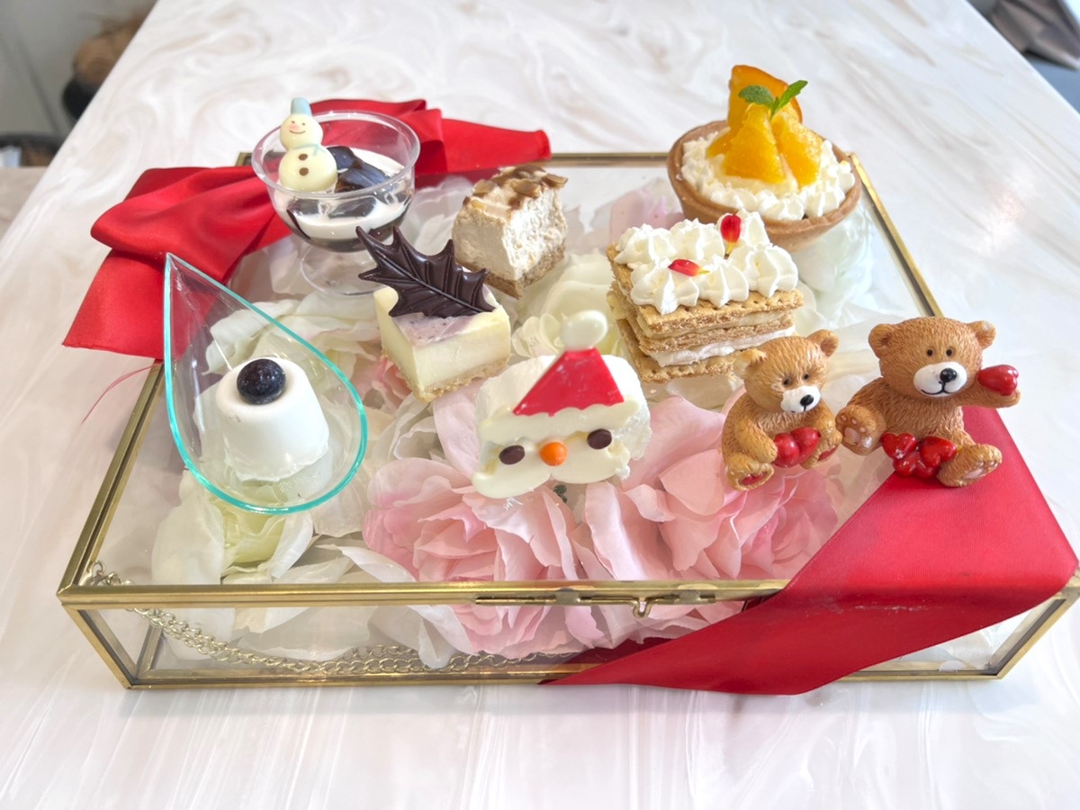 アフタヌーンティーのデザートを使っているのでクリスマス仕様のプレートなっております。