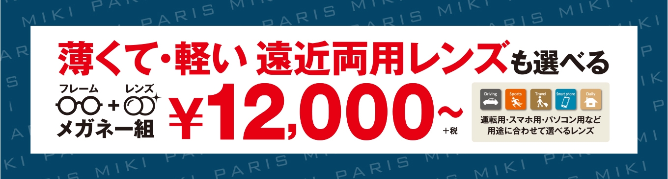 薄くて軽い遠近両用も選べるレンズ付き メガネ1組 12,000円(+税)より、様々なライフスタイルにお合わせしたメガネをご提案いたします。