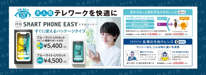 スマホやPCなど近くを見るときに目の負担を軽減させるため、レンズ下部には目のピント調整をサポートする「リラックスゾーン」を、レンズ上部には、裸眼と同じように遠くを見ることができる「クリアゾーン」を設けています。すぐに使える既製のパッケージタイプ(度付き、度無し、2タイプ)と、使う方の度数に合わせてオーダーが可能なレンズ(レンズ交換のみも可)がございます。