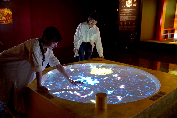 水の中を漂う様々な色の金魚に触れることで、金魚が色鮮やかなモチーフに変化します。