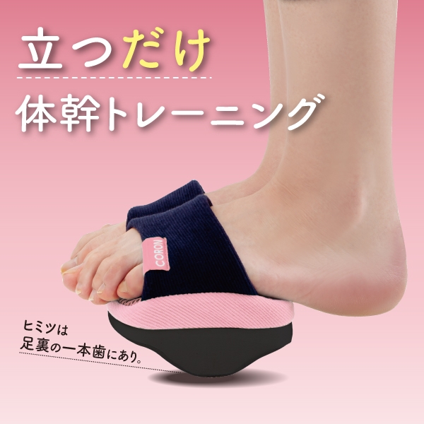 トップアスリート、スピードスケート、オリンピック選手などが実践している体幹トレーニングの一環。一本下駄の上で体幹を鍛えるためにスクワットなどの運動をしているということから企画を開始し本格的プロ仕様ではなく「ながら体幹トレーニング」が手軽に出来る仕様のスリッパを女性目線で企画したスリッパです。一本歯に見立てたソール部分にに立つだけで深層筋にアプローチ。体幹力を向上させ、基礎代謝を上げることで、痩せやすいカラダづくりを目指します。