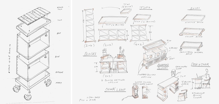また、ロゴマークにも採用されている幾何学的な立体形状Chunkは、家具の角や引き手など、人の手が自然と触れる位置に誂えられています。高さの調節など、生活をサポートするだけでなく、何気なく触れた時に感じる木の質感や温もり。日本の森林から生まれたChunkは、使い手の手に天然素材の優しさを思い起こさせ、空間に穏やかな時間をもたらすでしょう。