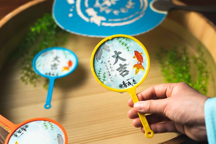 金魚すくいの際に使用するポイの形をしたおみくじです。ポイを選んで、水に浸すと、ポイの表面に運勢が浮かび上がるのが特徴です。運勢に加えて、青森屋での滞在をより楽しむためのひとことが津軽弁で書かれています。ポイは、旅行の思い出として持ち帰ることができます。