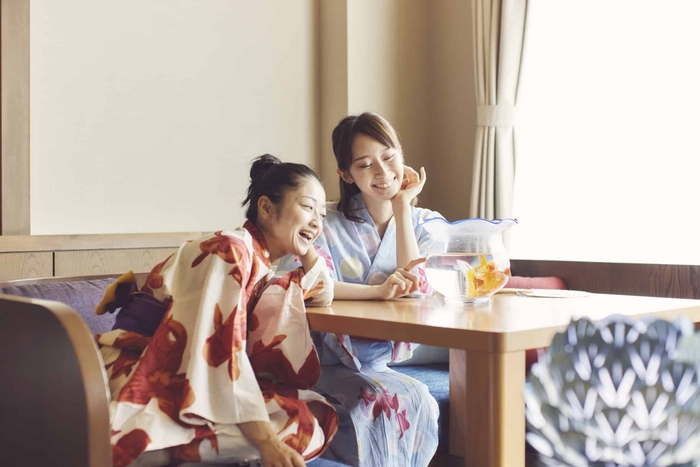 色とりどりの金魚が入った金魚鉢の中から好きなものを選べます。客室では、ゆらゆらと水の中で優雅に泳ぐ金魚を眺めながら、涼を感じるひと時を過ごせます。