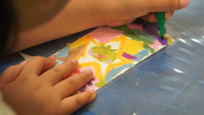 自然由来の豊かな質感と色とりどりの阿波和紙を台紙にちぎって貼り、その上にオリジナルの夢や願い事を短冊に書いたり、缶バッチにして楽しむ体験。